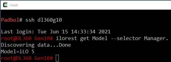 The following picture shows an SSH root session creation, toward an HPE DL360 Gen10 with the execution of an iLOrest GET command without any formal login process. The Discovering data...Done message means that iLOrest could effectively log into the local iLO 5 and save metadata in its cache. Then, it displays the output of the GET command (Model=iLO 5).