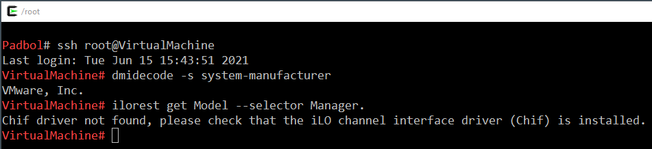 The following figure shows an SSH privileged session into a VMware virtual machine and an iLOrest in-band GET command returning the error.