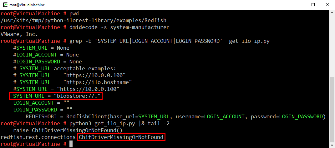 The target URL (SYSTEM_URL) points to blobstore://. and, the LOGIN_ACCOUNT and LOGIN_PASSWORD variables are empty. With this configuration, the RedfishClient method will try to connect to the CHIF driver to access the local iLO. However, it fails because it the script is executed on a virtual machine.