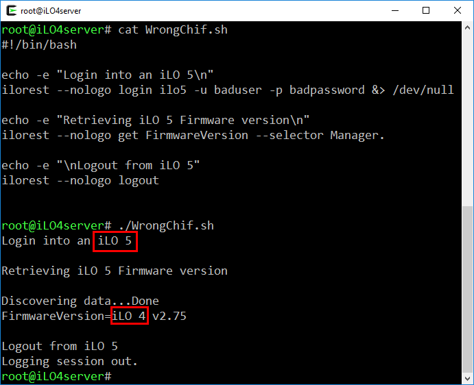 The following picture displays a script launched from an iLO 4 based computer, targeting an iLO 5, but supplying faulty username and password in the login command and discarding errors (&> /dev/null).